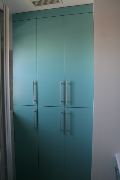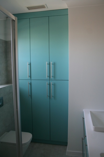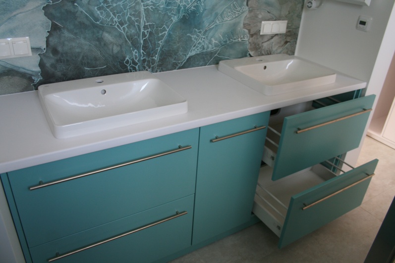 Meble łazienkowe wykonane z płyty meblowej, blat posformingowy.