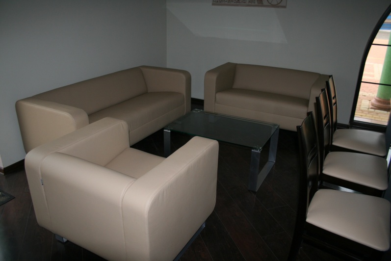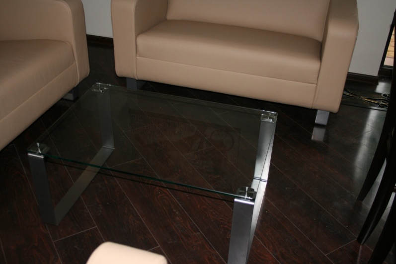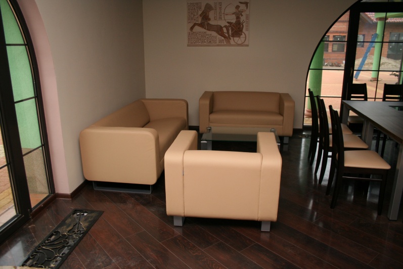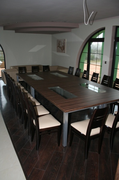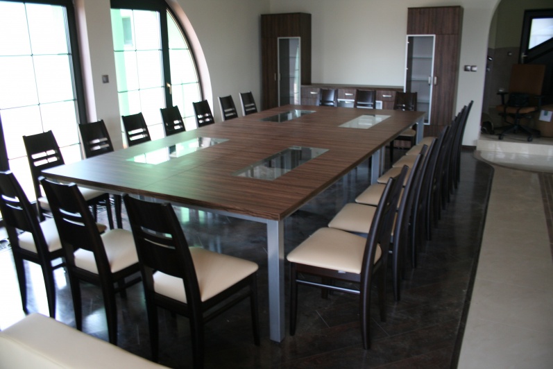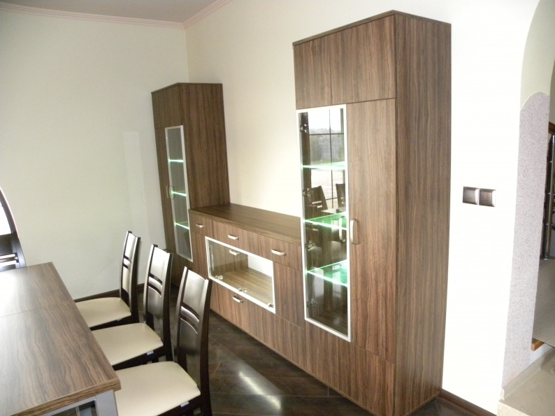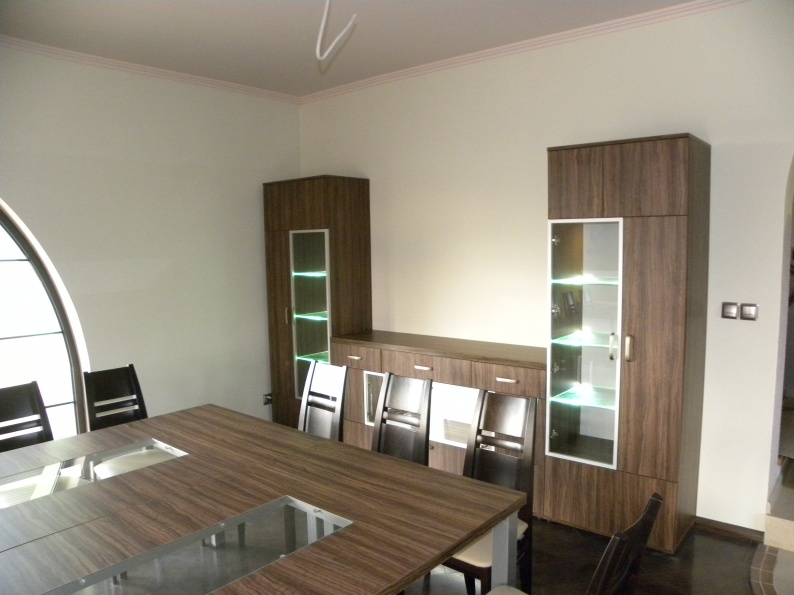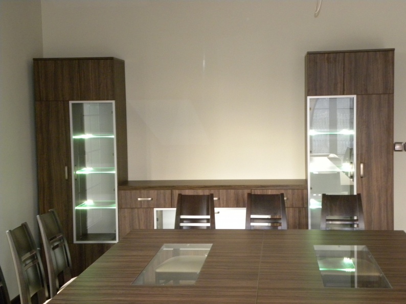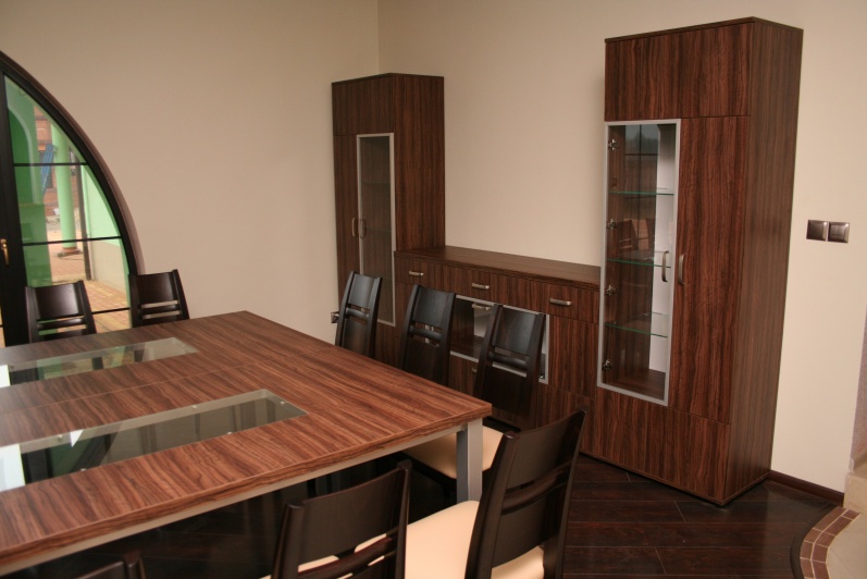 Meble wykonane z płyty meblowej Oliwka Sewilla. Zestaw zawiera stoły modułowe na stelażach metalowych ze wstawkami ze szkła, szafki przeszklone z oświetleniem ledowym oraz komplet wypoczynkowy kanap ze stolikiem firmy Marbet Style. Do zestawu dopasowano również krzesła firmy Nowy Styl w tapicerce zbliżonej do kanap.
