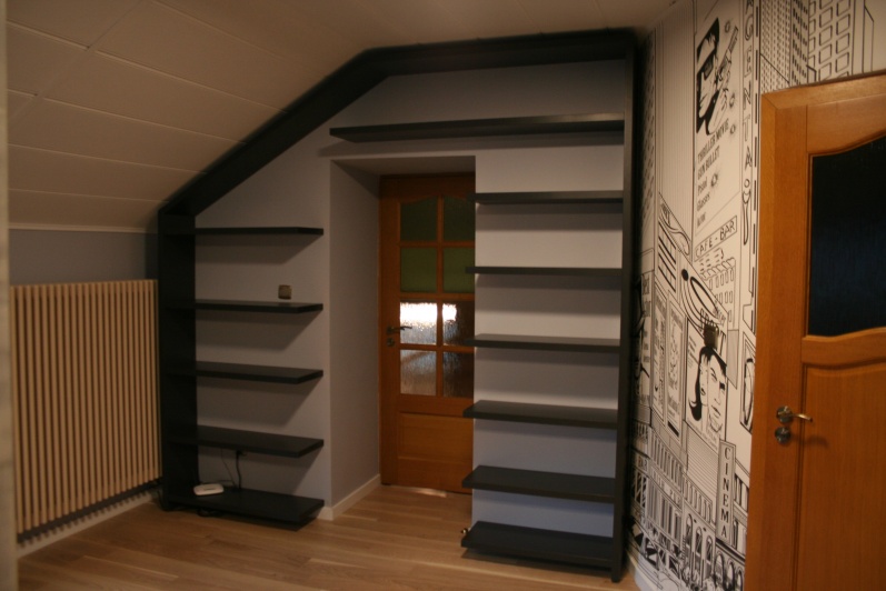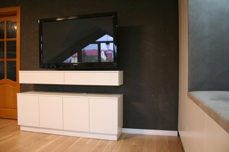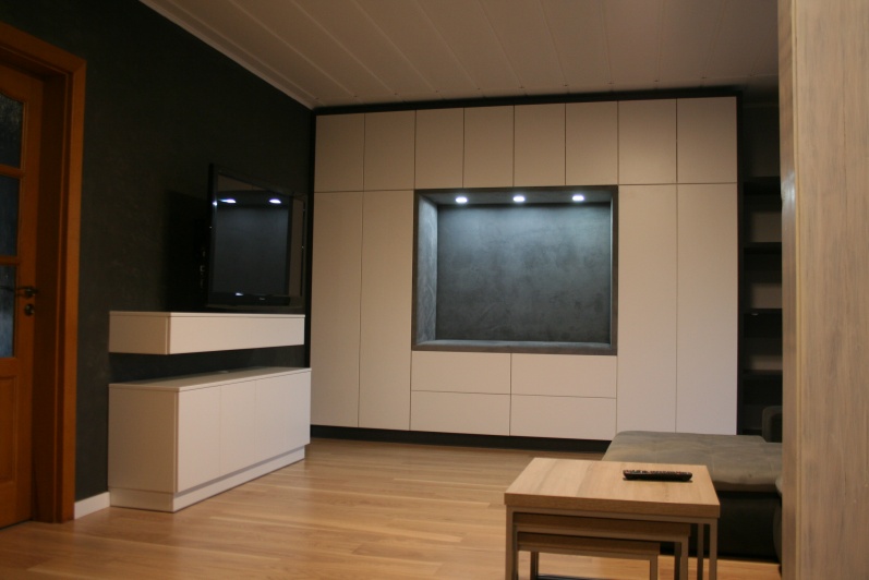 Meble do salonu / pokoju dziennego zawierające zabudowę szaf z podświetlonym elementem tapicerowanym, zabudowę regałów otwartych oraz komplet stolików kawowych. szafke RTV. fronty wykonane z płyty lakierowanej w macie w kolorze białym firmy EGGER.