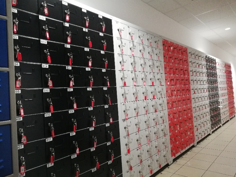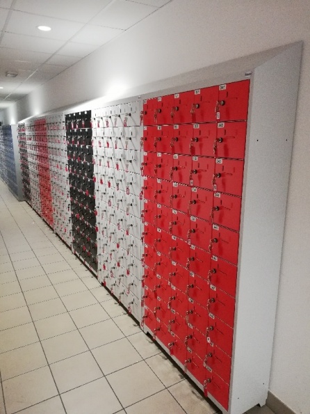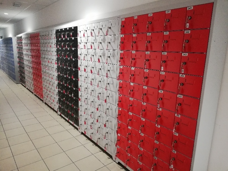 Szafki metalowe, skrytkowe dla pracowników, wyprodukowane w kolorach logo firmy Magna Formpol.