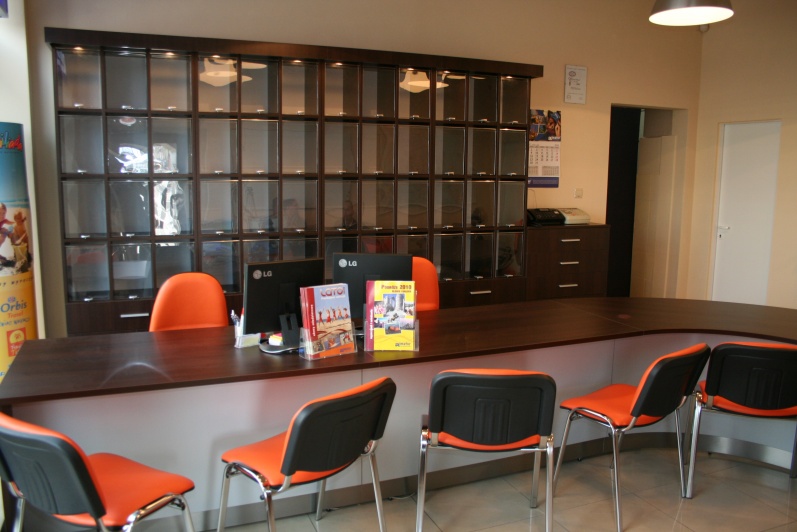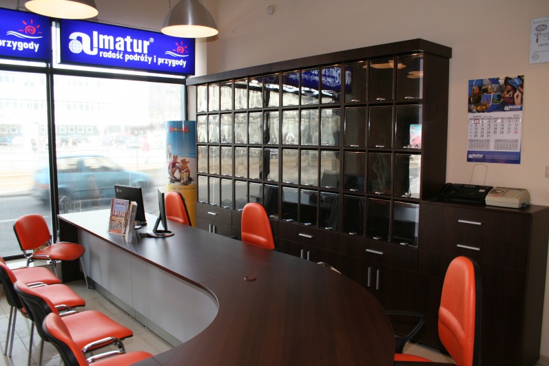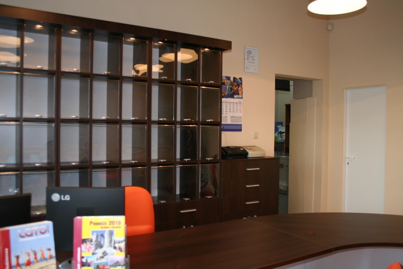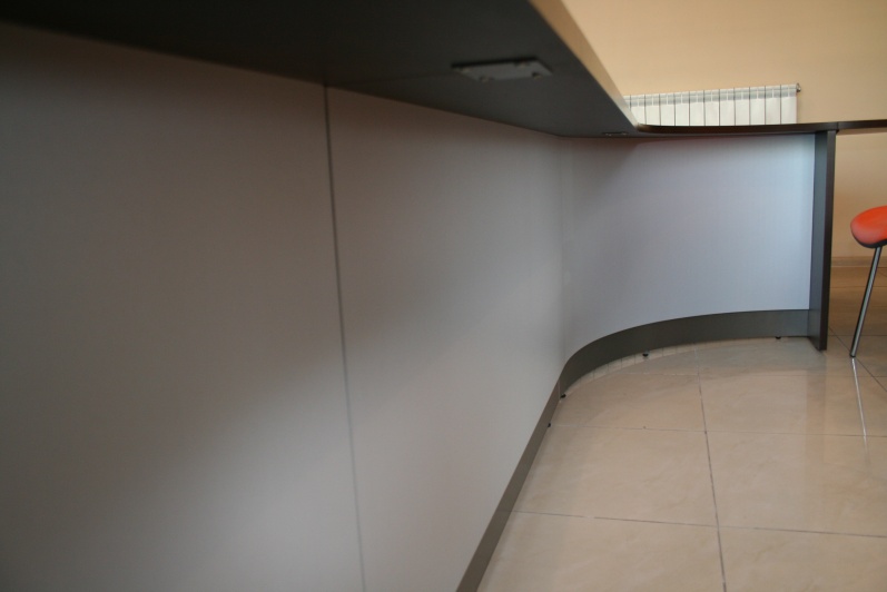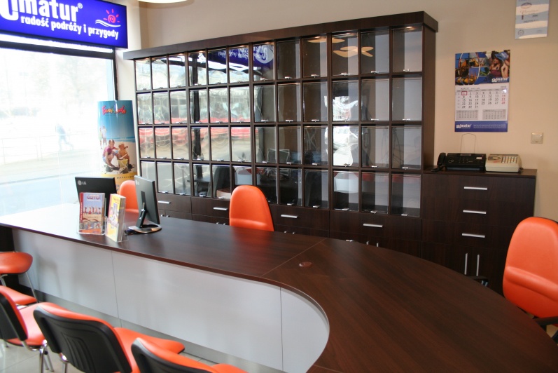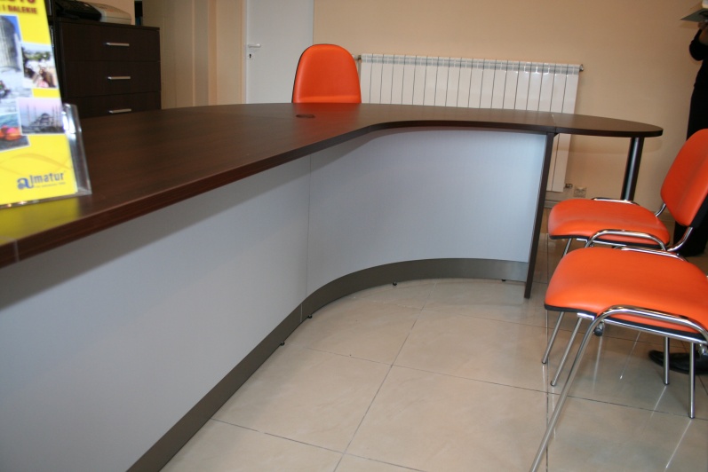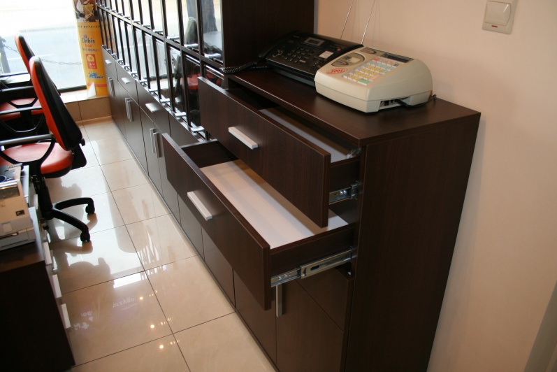 Klasyczny, funkcjonalny system lad biurowych wykonanych z płyty wiórowej laminowanej, oklejonej obrzeżem PCV dobrany do koloru płyty. Zestaw wykonany w dwóch tonacjach kolorystycznych - panele - Aluminium M 8582 oraz pozostałe elementy - Kasztan Wenge R 4121.