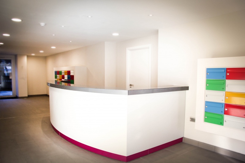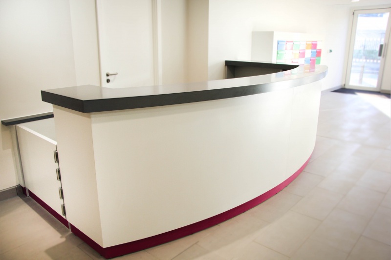 Lada recepcyjna wykonana z płyty meblowej Kronospan, cokolik - laminat HPL, blat Staron.