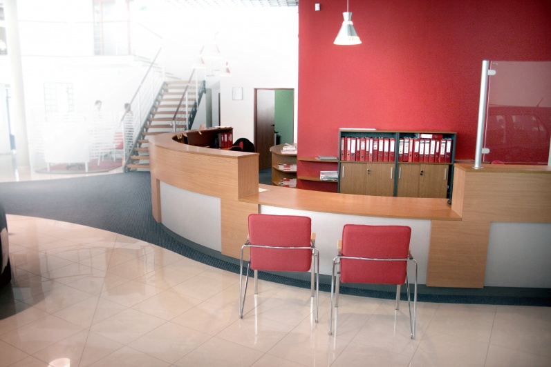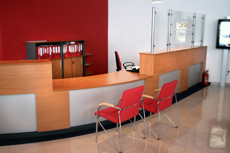 Lada wykonana z płyty melaminowej w kolorach buk jasny, antracyt i aluminium prążkowane. Meble pomocnicze w materiałach identycznych jak lada. Sztukateria meblowa - aluminiowa. Boks kasowy wykonany ze szkła bezpiecznego gr. 8mm.