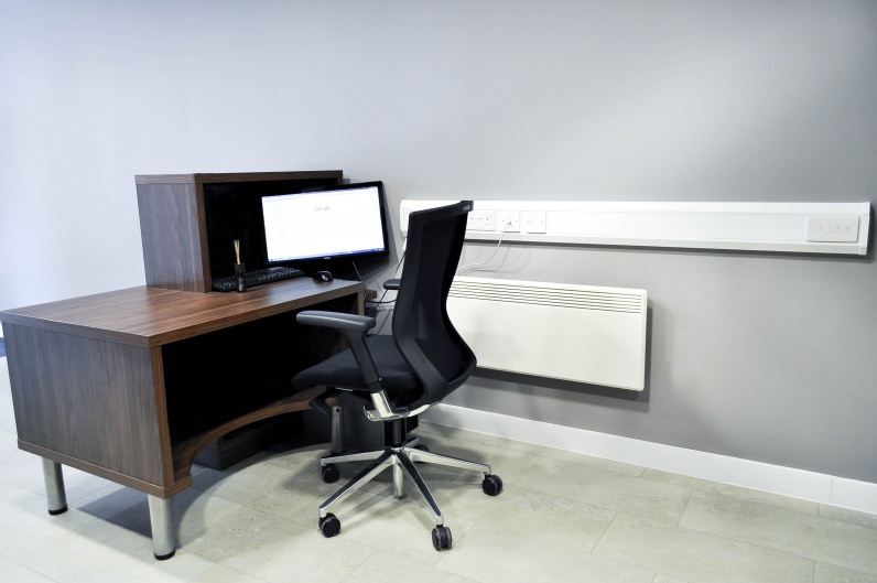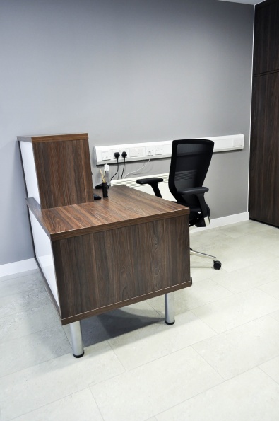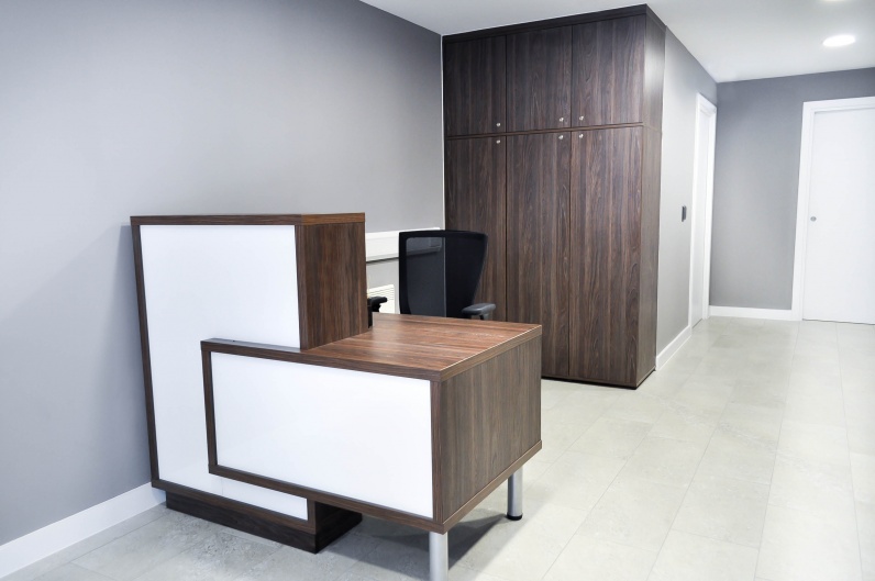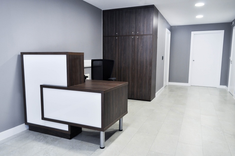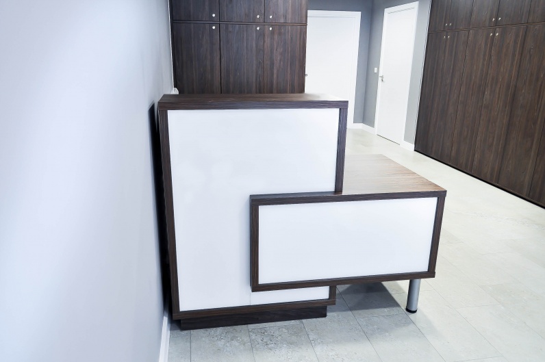 Lada recepcyjna wykonana w płycie meblowej w połączeniu ze szkłem w kolorze białym w panelu przednim.