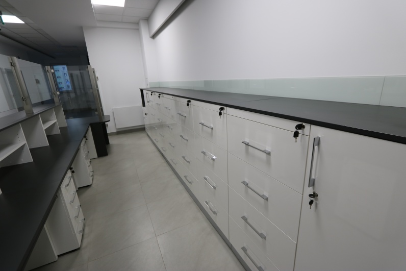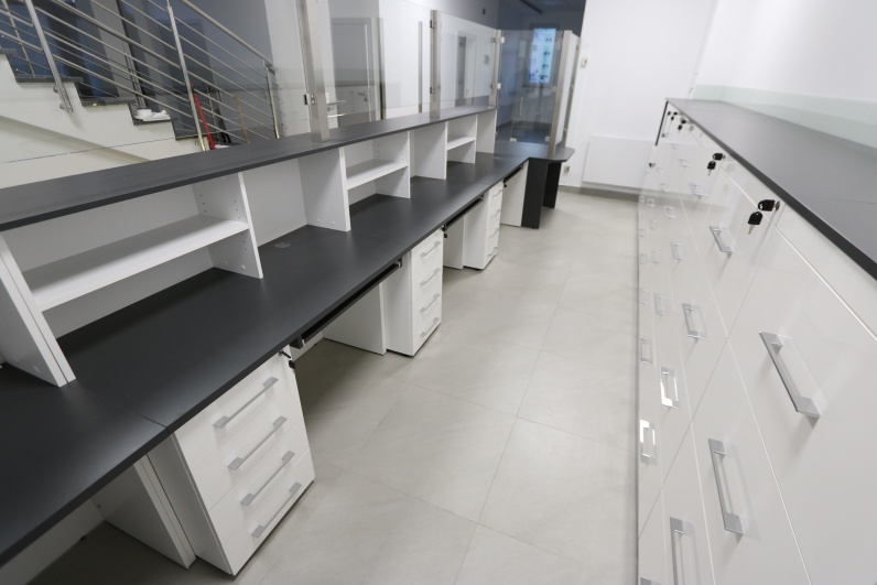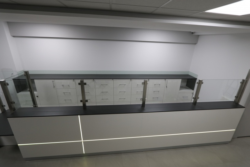 Lada recepcyjna, panel w płycie meblowej połysk. Oświetlenie led w panelu przednim lady.