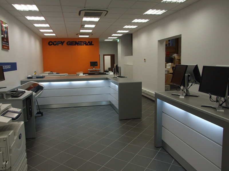 Profesjonalny zestaw lad do obsługi klienta w nowoczesnym stylu wykonany w laminatach HPL z podświetleniem w połączeniu z aluminium anodowanym. Lady wyprodukowane według projektu firmy Limba.