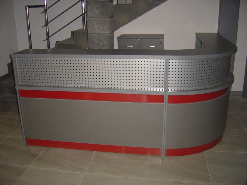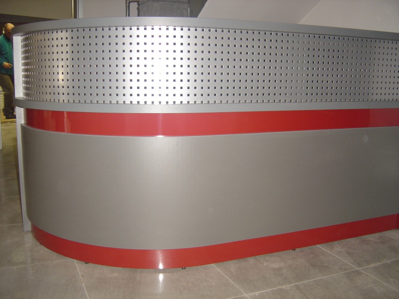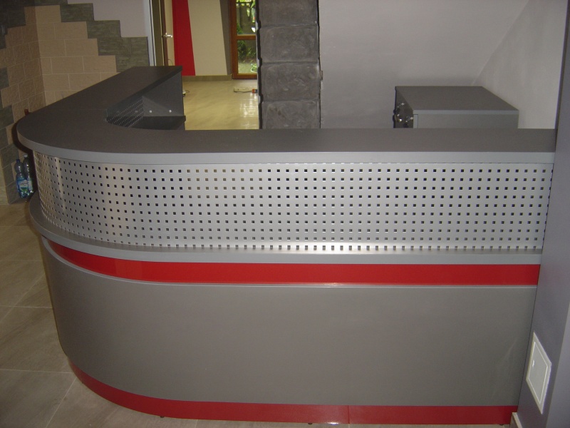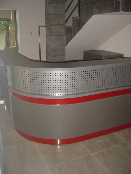 Lada gięta wysoka wykonana w laminatach HPL oraz w płycie meblowej kolor Antracyt. W nadstawce zastosowano blachę perforowaną.