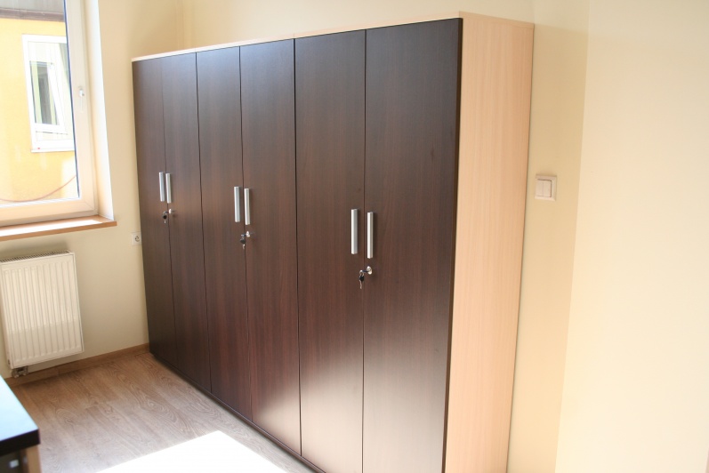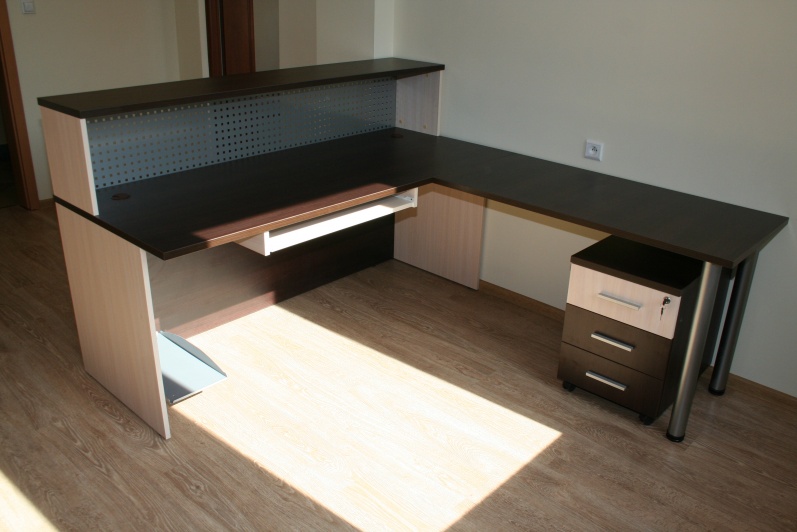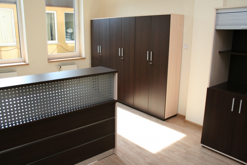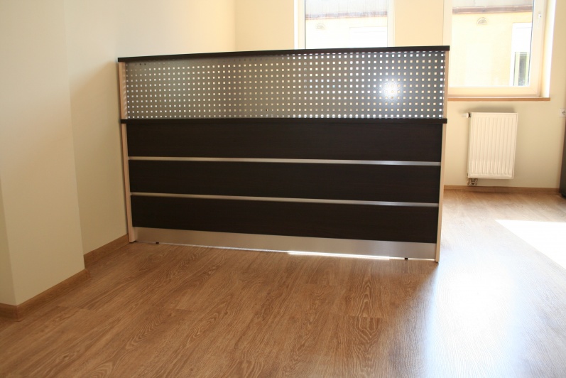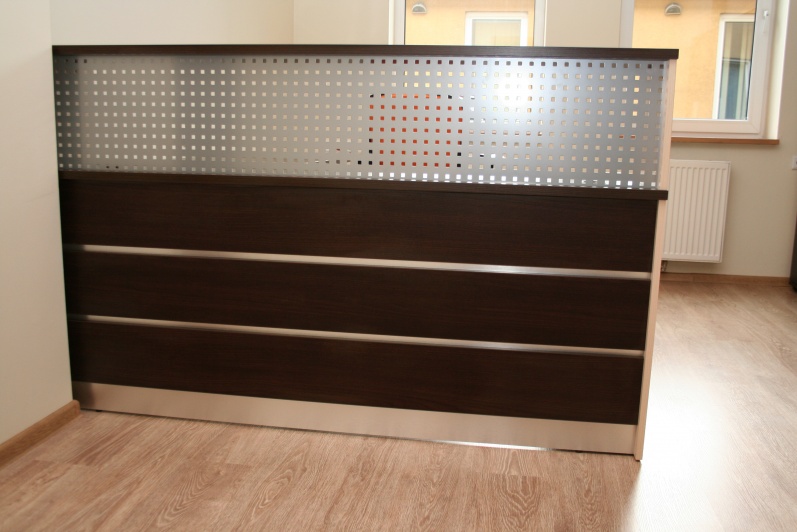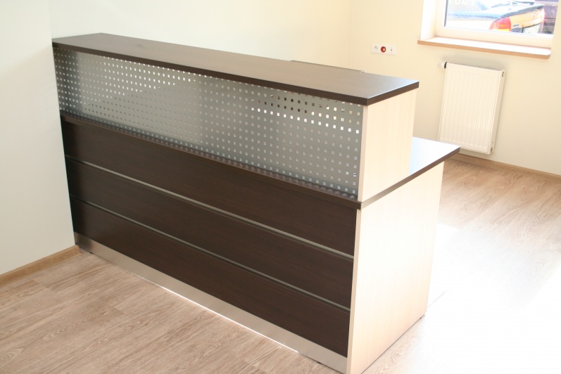 Lada recepcyjna prosta z nadstawką wypełnioną blachą perforowaną. W panelu przednim boniowanie wypełnione laminatem w kolorze stali szczotkowanej. Lada wykonana w kolorach Kasztan Wenge i Dąb Mleczny. Lada w komplecie z szafami aktowymi oraz szafką gospodarczą z roletą aluminiową.