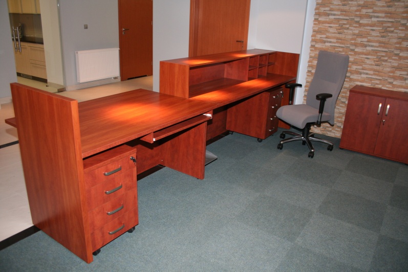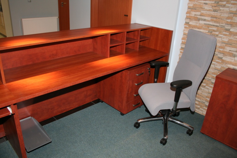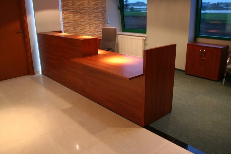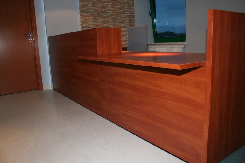 Lada recepcyjna wykonana z płyty meblowej w kolorze Grusza Dzika r 4967 w połączeniu z elementami z laminatu HPL w pasującym kolorze.