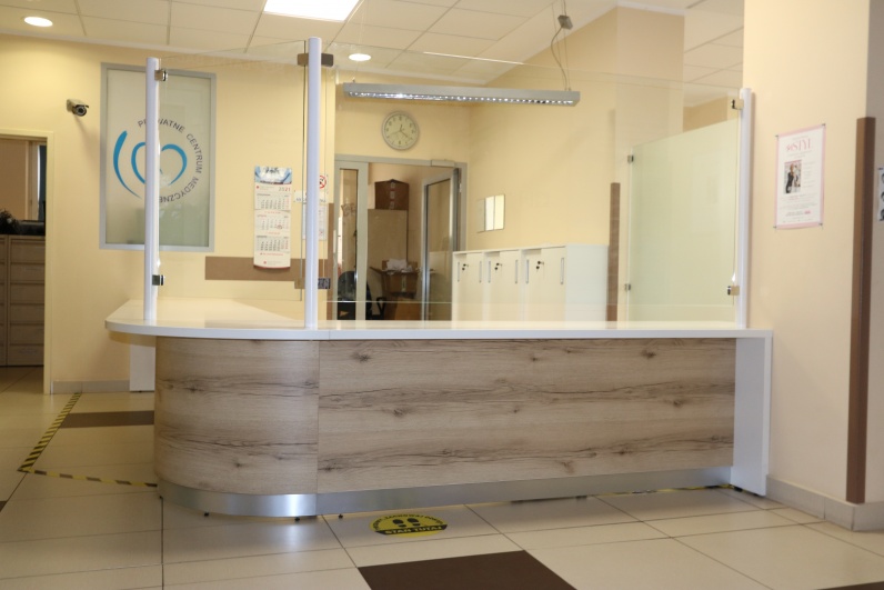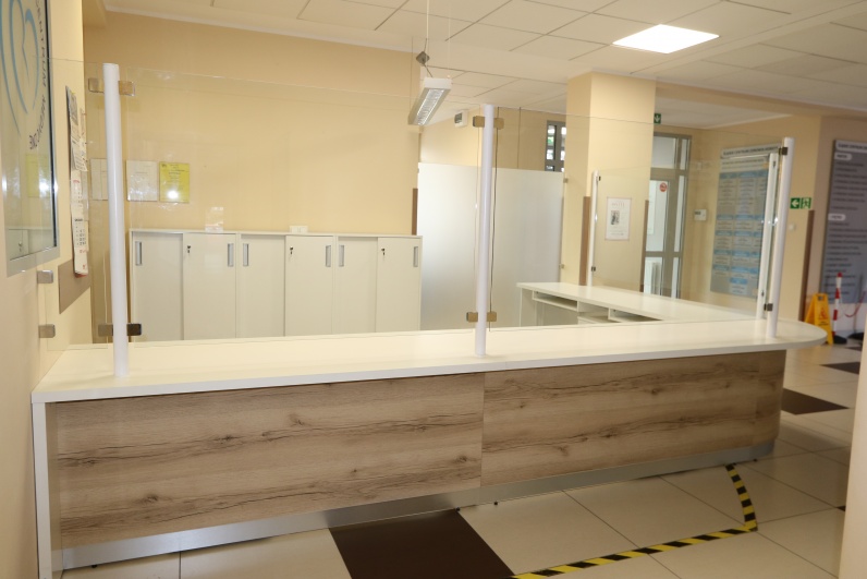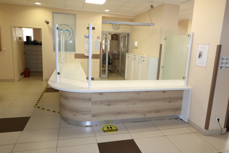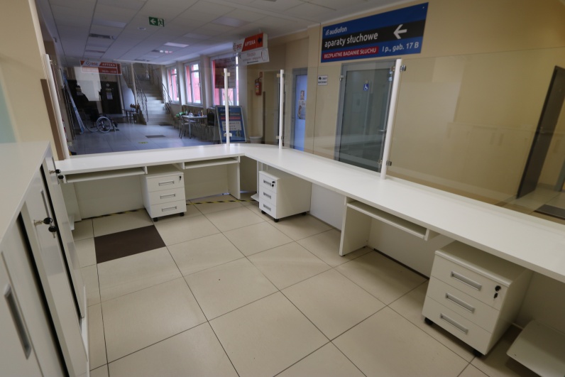 Lada recepcyjna, gieta z przeszkleniem - szkło hartowane w słupkach aluminiowaych w kolorze białym pasującym do blatu roboczego. Panel przedni lady - płyta meblowa Dąb Grand. Blat roboczy płyta biała.
