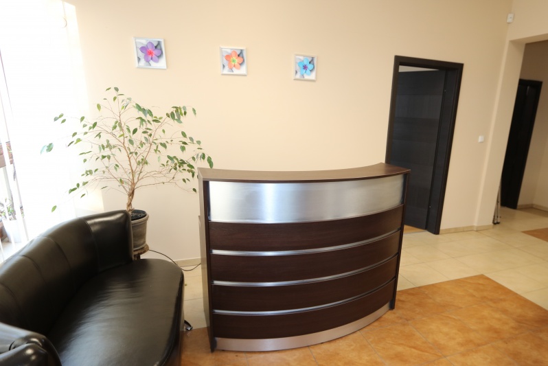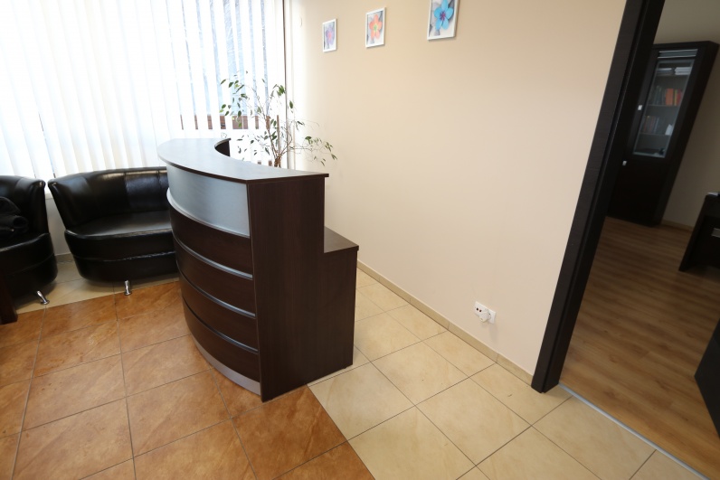 Niewielka, gieta lada recepcyjna. Dekor - Kasztan Wenge. Boniowanie wyklejane laminatem HPL w stali szczotkowanej.