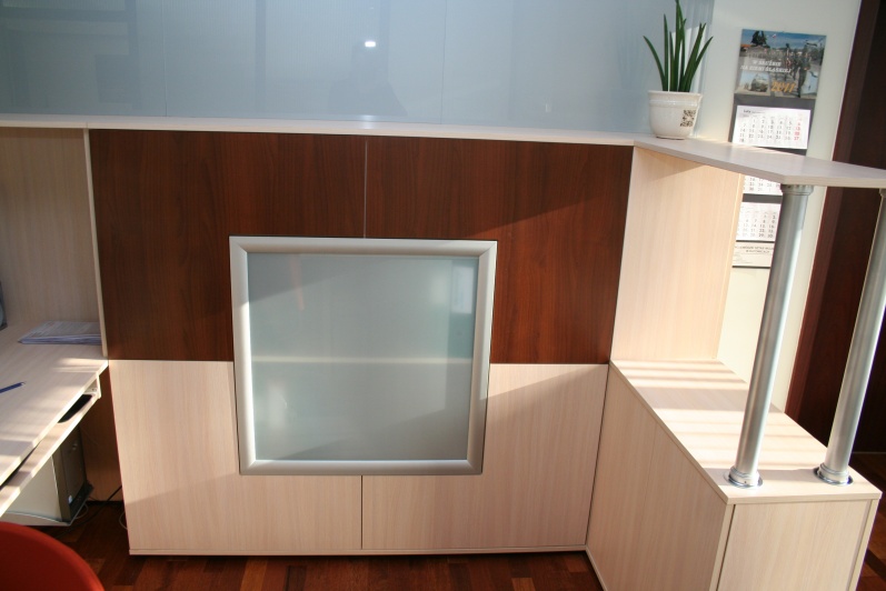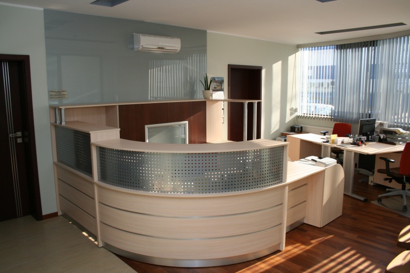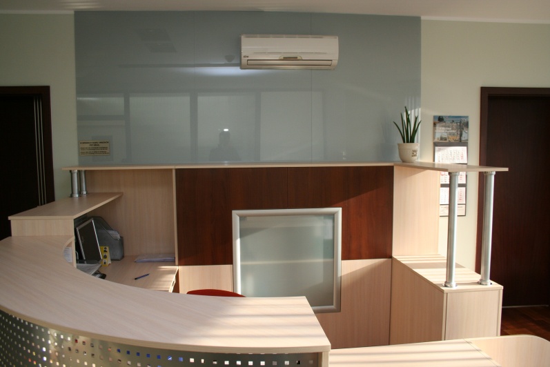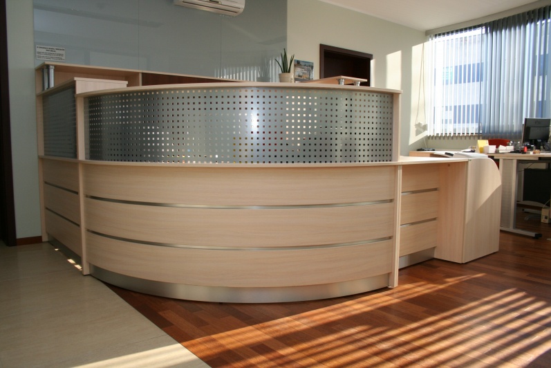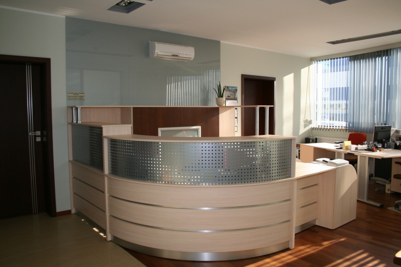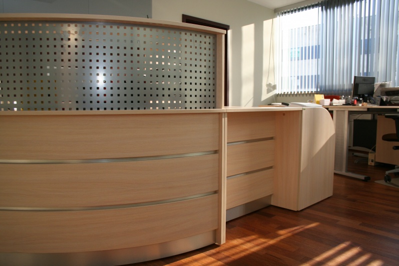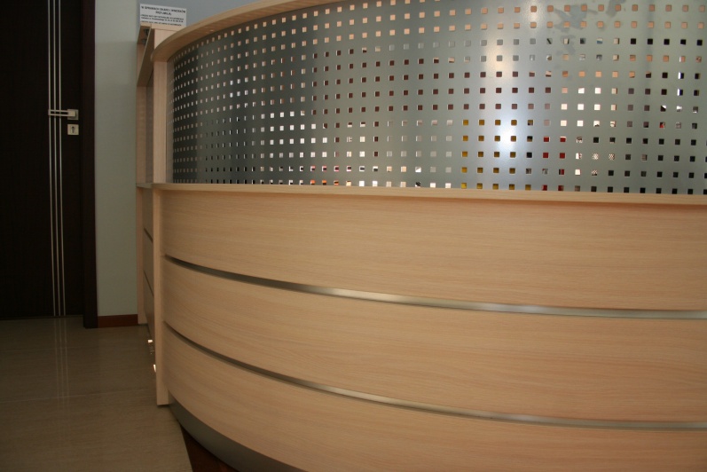 Lada recepcyjna gięta wykonana z boniowaniem, płyta Dąb Mleczny R 4120 z wstawkami z laminatu HPL w kolorze imitującym aluminium. W nadstawce lady zastosowano blendę z blachy perforowanej pomalowanej proszkowo w kolorze Ral 9006. W szafkach za ladą zastosowano dla kontrastu Orzech Artemide R4890, z systemem bezuchwytowego zamykania drzwi 'push'. Na ścianie zamontowano szybę lakobel w kolorze Ral 9006.