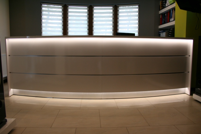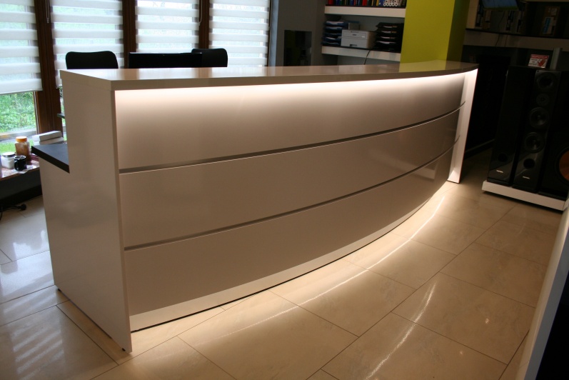 Lada recepcyjna z boniowaniem na panelu przednim. Lada wykonana z płyty meblowej Pfleiderer Legno Ciemne w połączeniu płyta meblową w połysku.