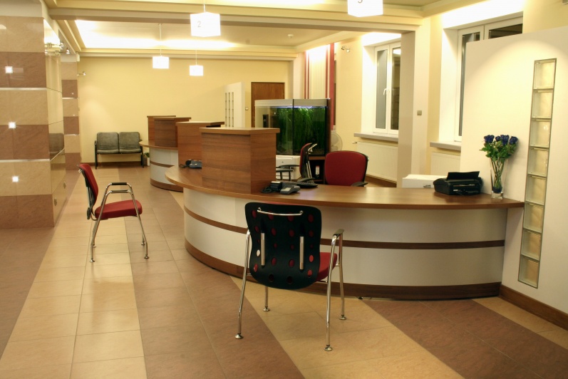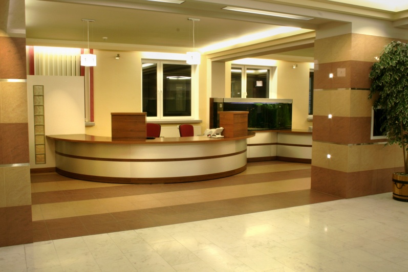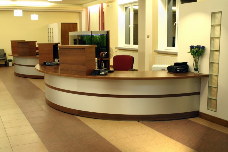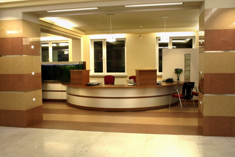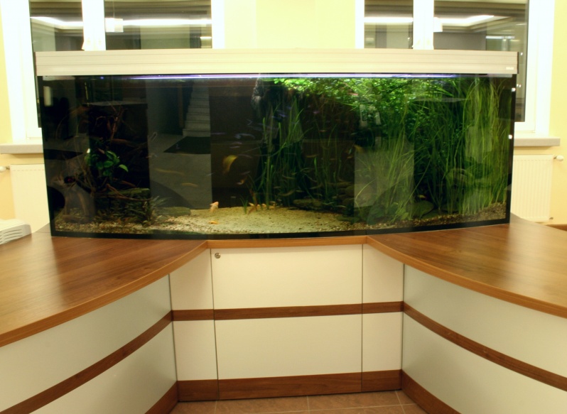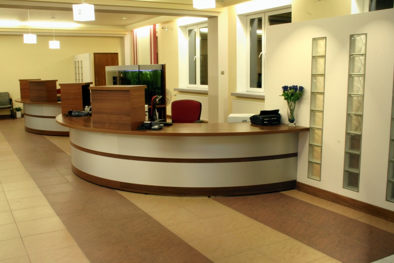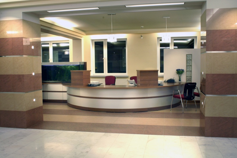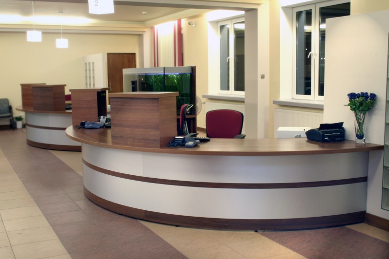 Lada recepcyjna wykonana z połączenia laminowanej płyty w kolorze orzech ciemny z laminatem aluminiowym - prążkowanym. Symetryczne elementy lady zespolone łącznikiem na, którym postawione zostało akwarium o pojemności 800 litrów.