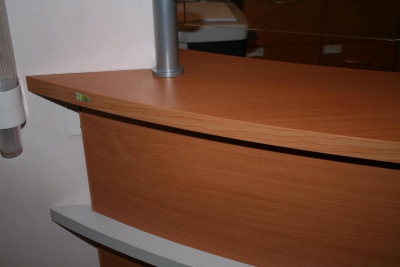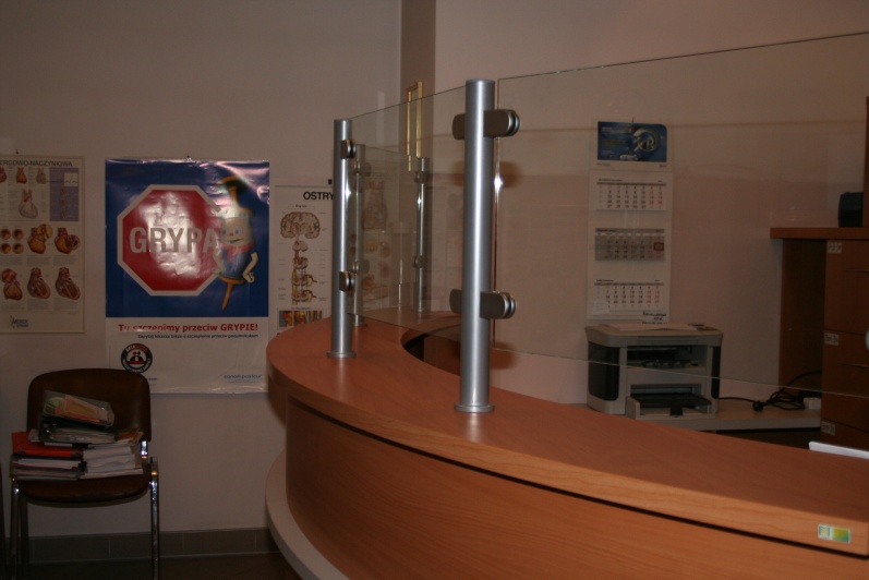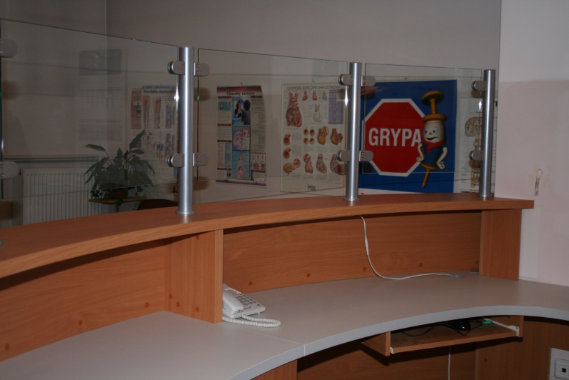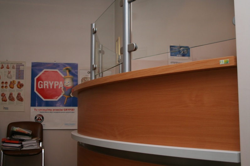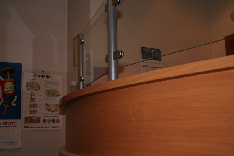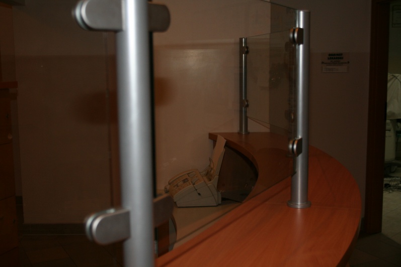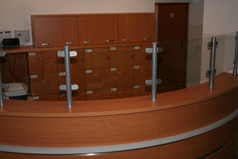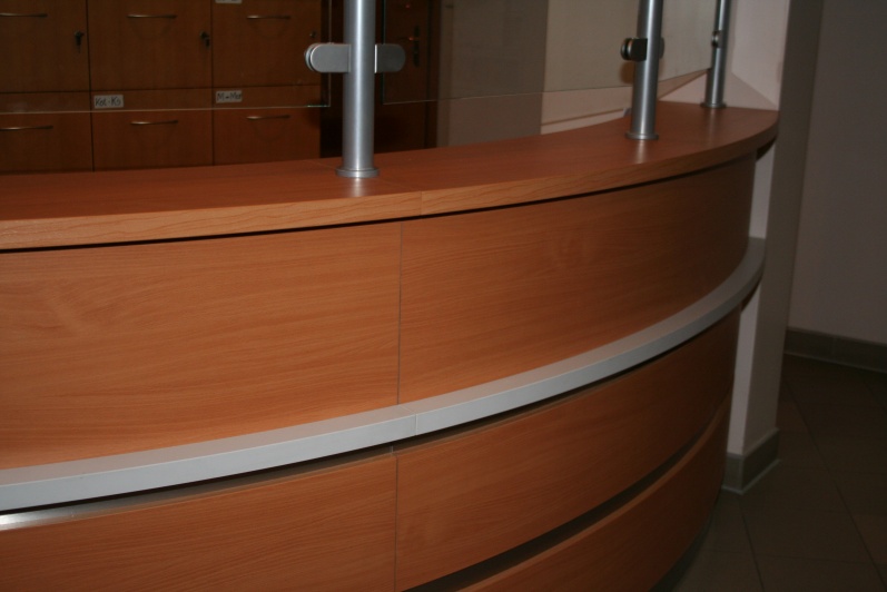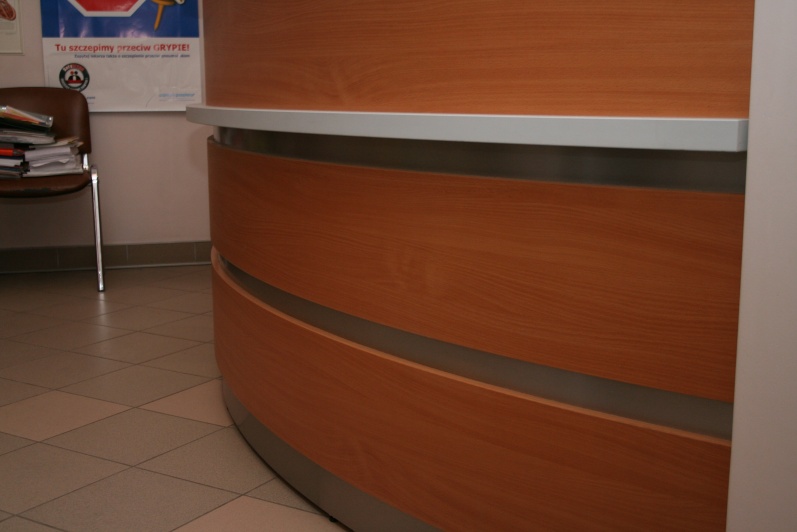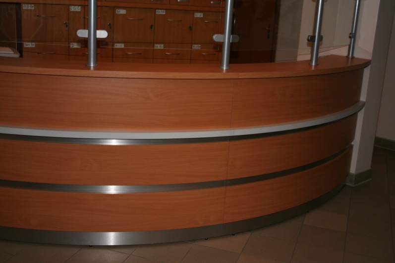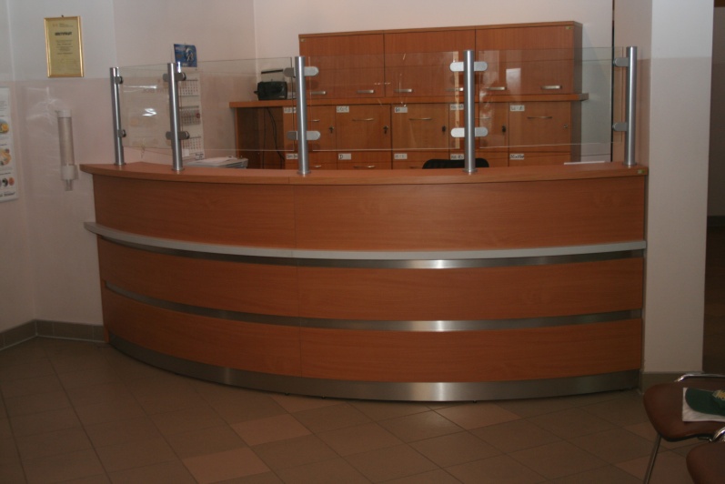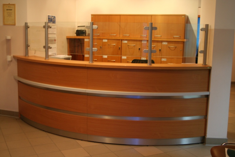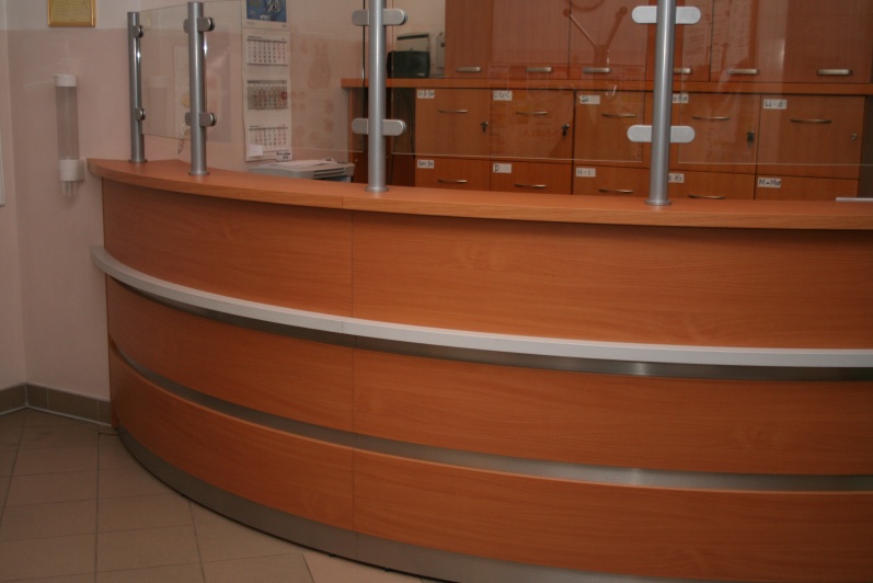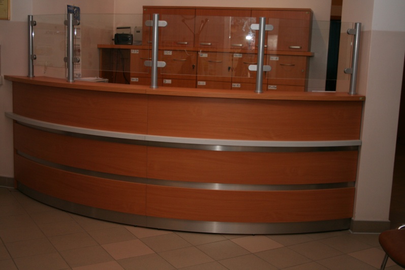 Lada recepcyjna gieta w kolorze Buk Bawaria R 5111 ze wstawkami z laminatu HPL w kolorze aluminium. Na nadstawce zastosowano szkło P4 w profilach aluminiowych.