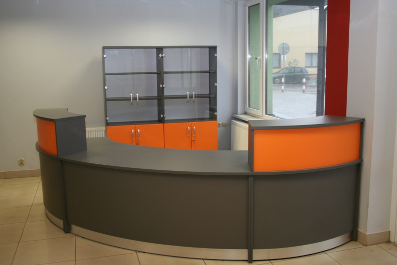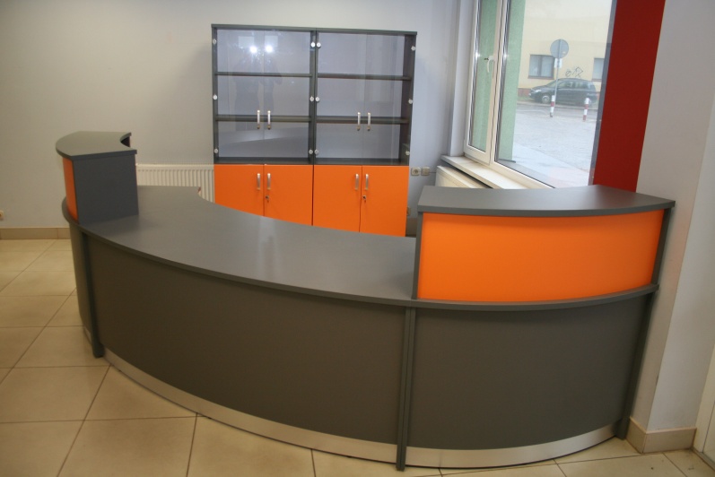 Lada recepcyjna wykonana z płyty meblowej w kolorze Antracyt w połączeniu z kolorem Global Orange.