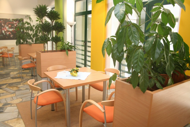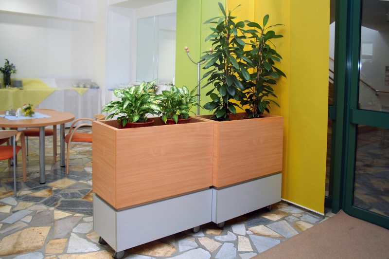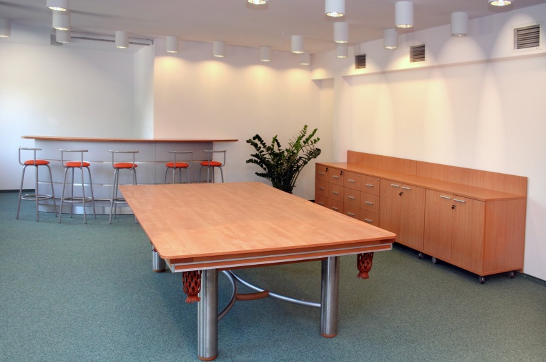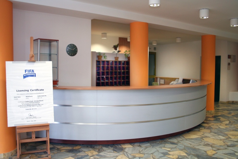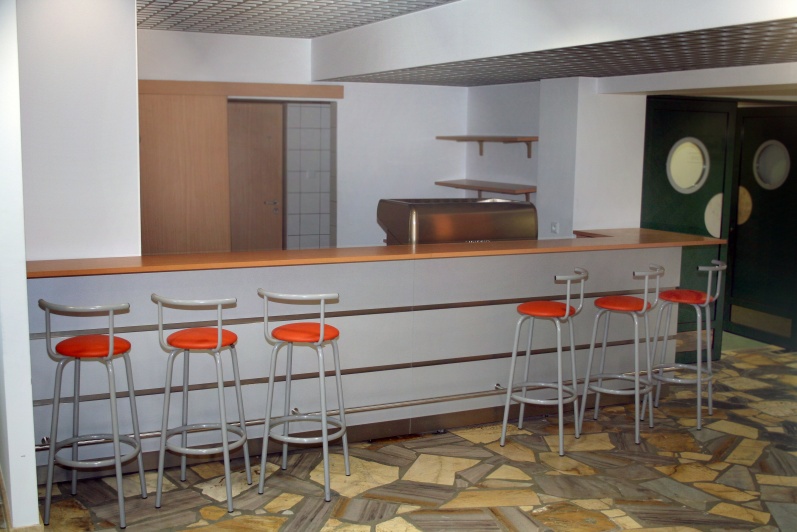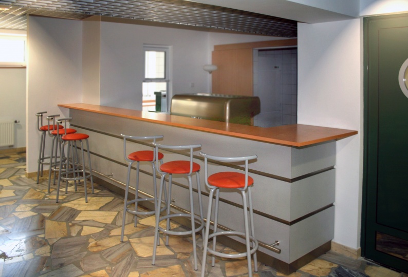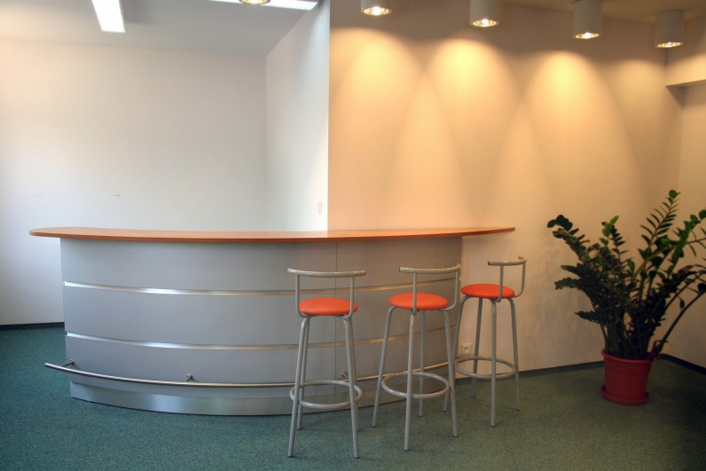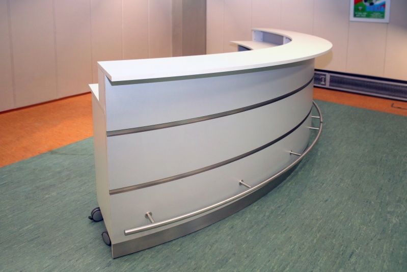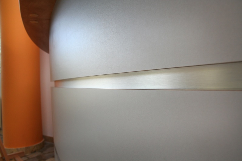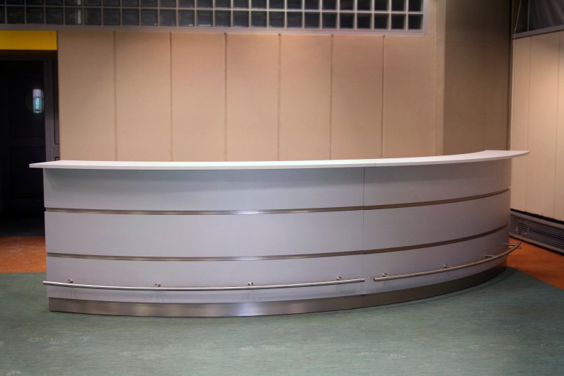 Lady barowe oraz recepcyjne wykonane z płyty w kolorze aluminium. Szczeliny i cokoły oklejone laminatem. Od frontu zamontowany został reling ze stali nierdzewnej szczotkowanej.