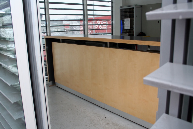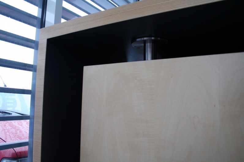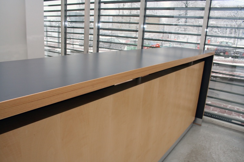 Blat i boki lady oklejone laminatem w kolorze antracyt, zabrzegowane sklejką lakierowaną. Elementy dodatkowe wykończone fornirem klonowym. Sztukateria meblowa ze stali nierdzewnej, szczotkowanej.