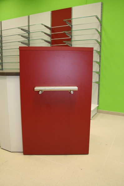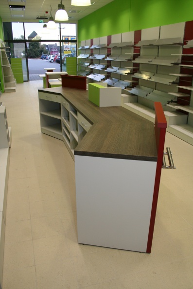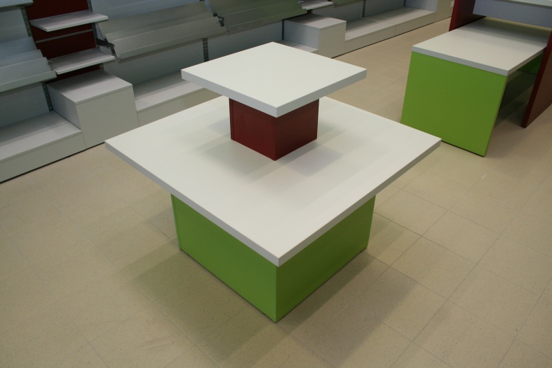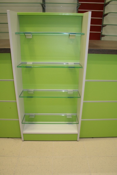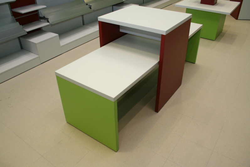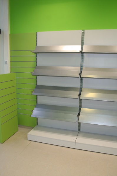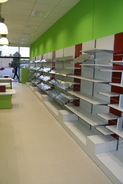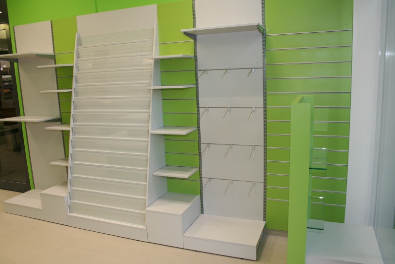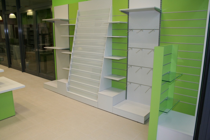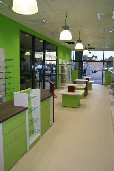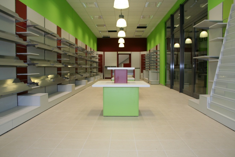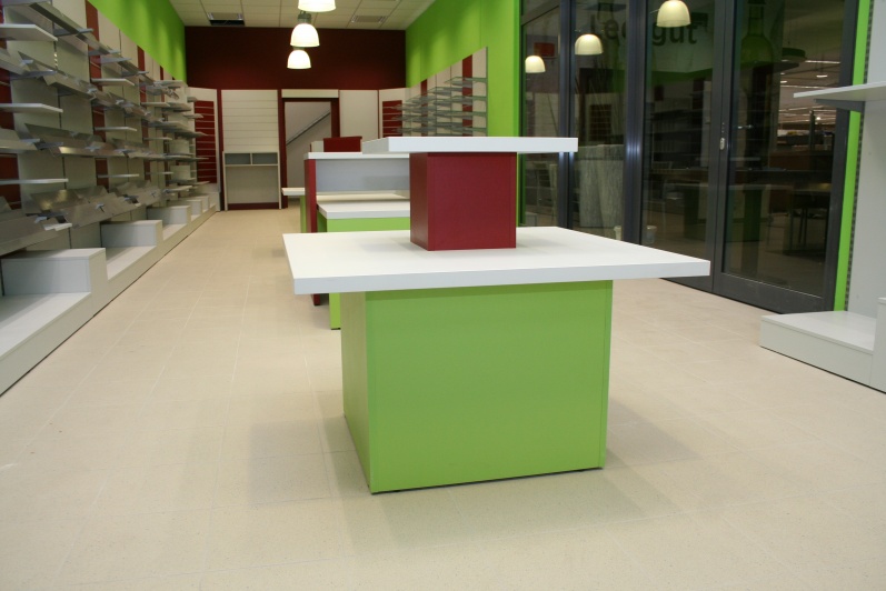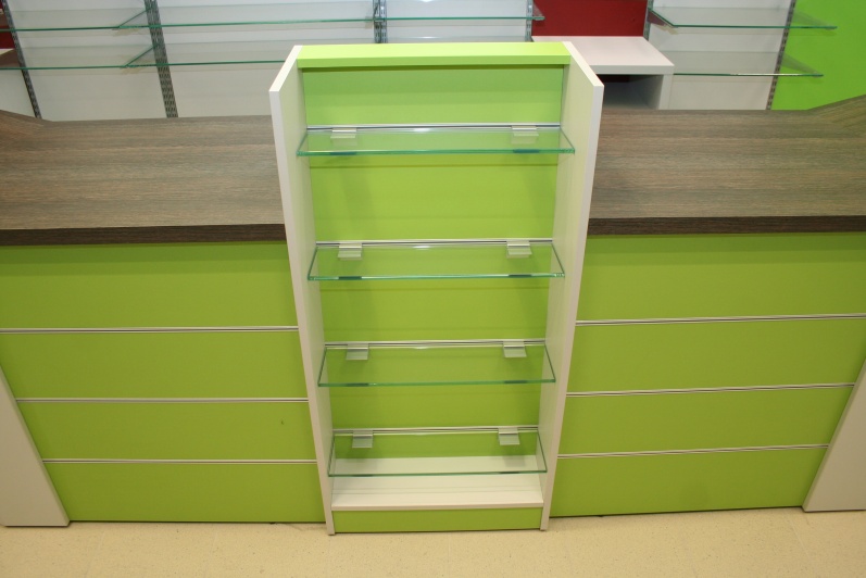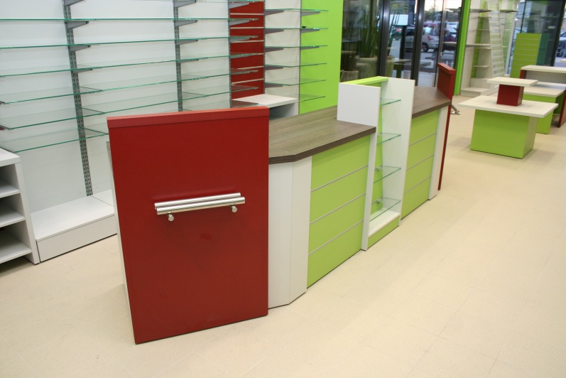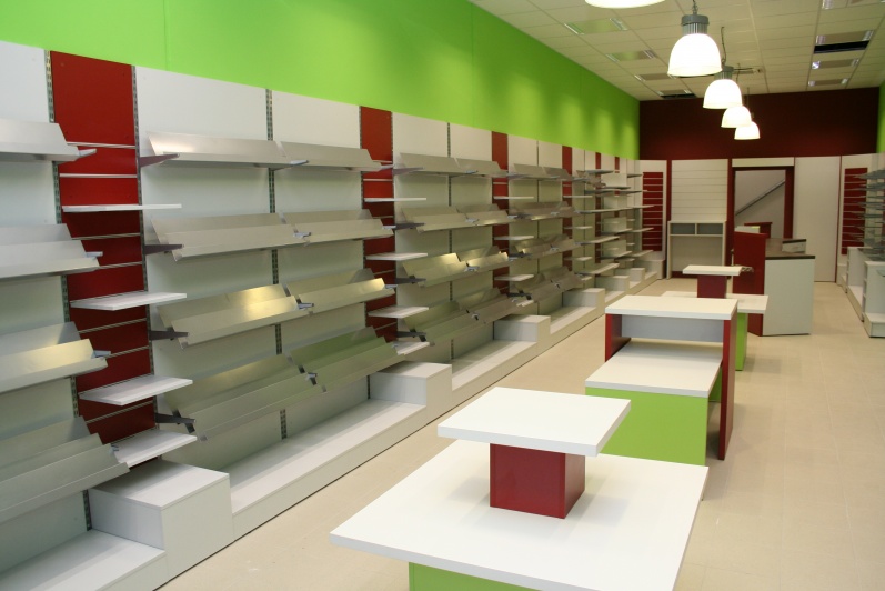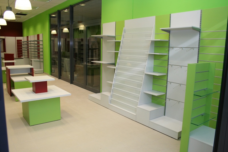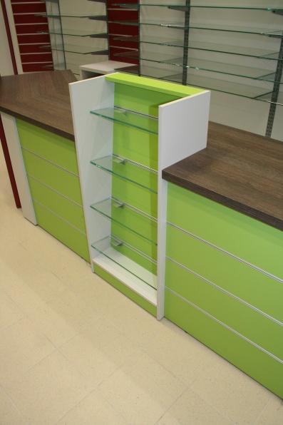 Meble sklepowe wykonane z płyty meblowej w kontrastowych kolorach: zieleń i limonka w połączeniu z kolorem bordo oraz szarym. Zastosowano półki wykonane ze stali oraz szkła hartowanego mocowane w systemach Zobal i Sevroll.
