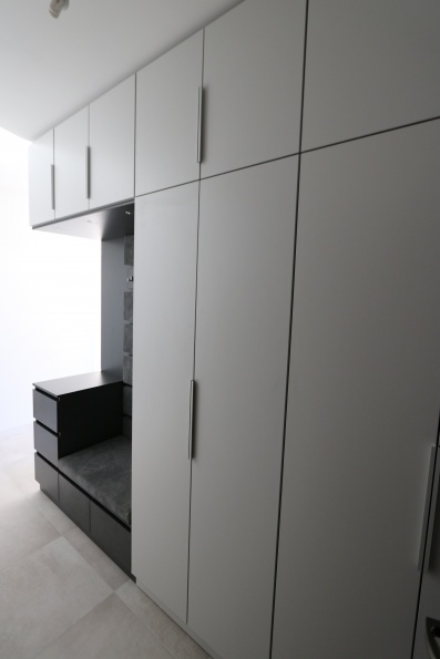 Garderoba z siedziskiem tapicerowanym. Płyta meblowa antracyt w połączeniu z płytą białą.